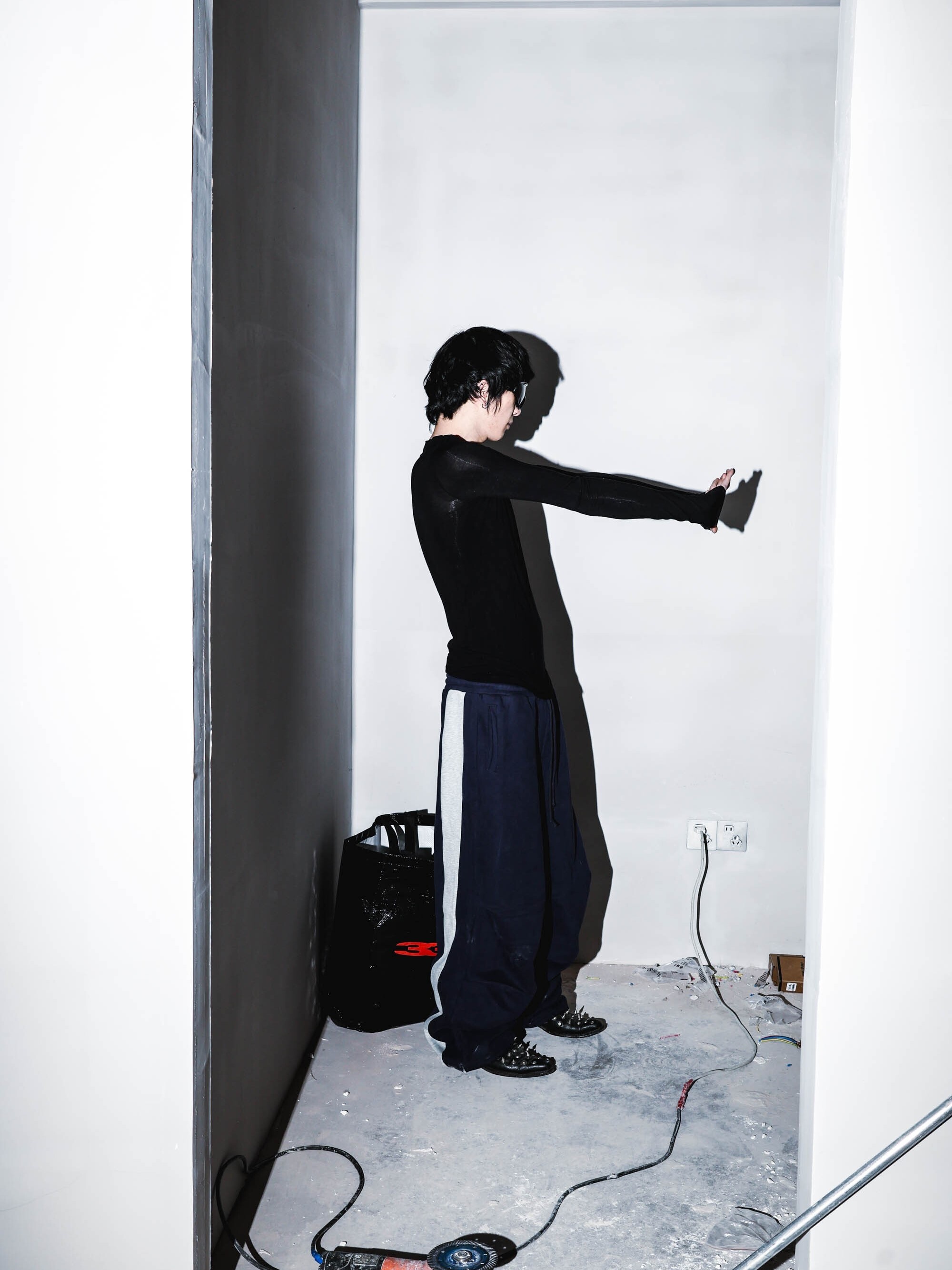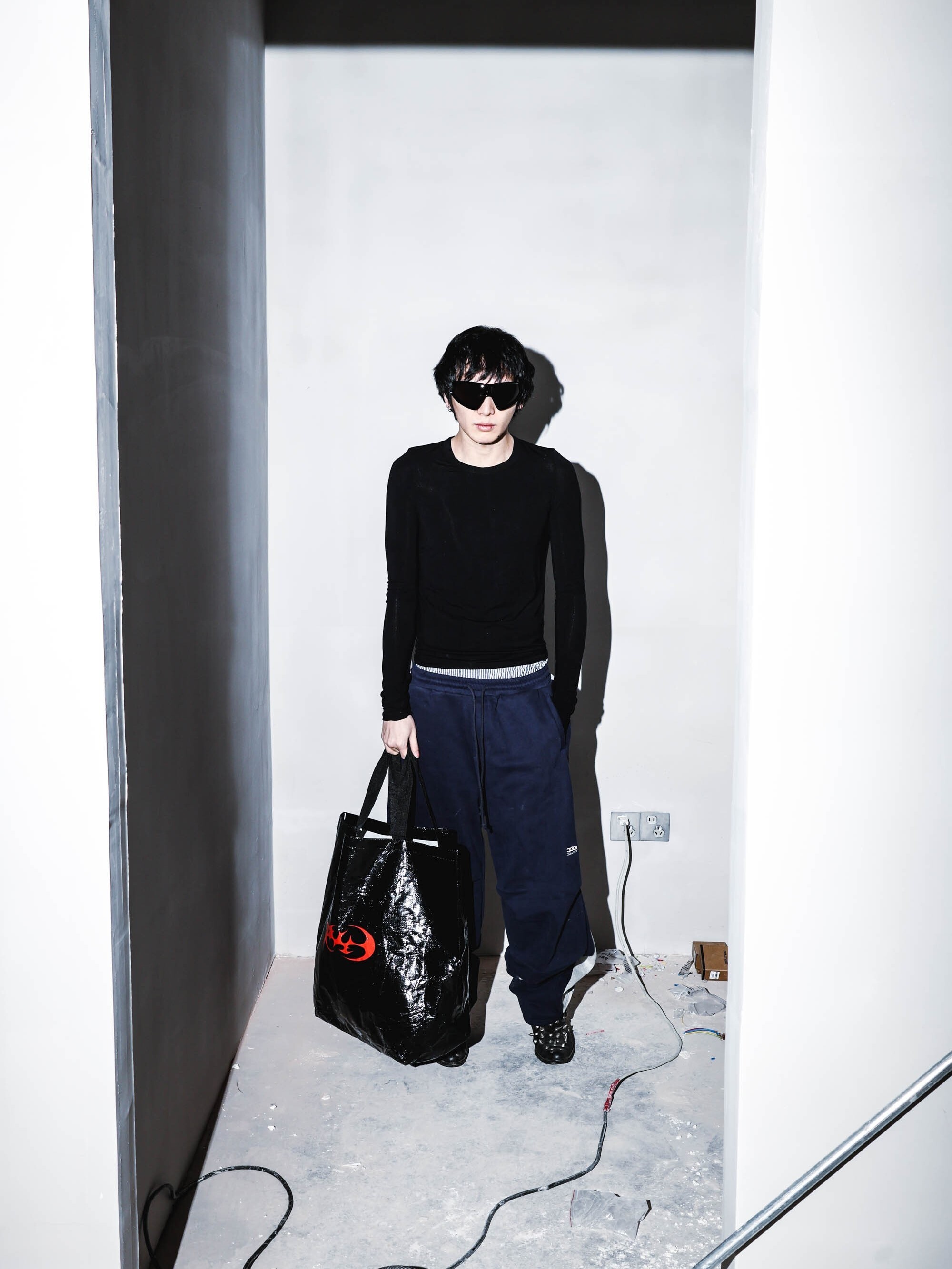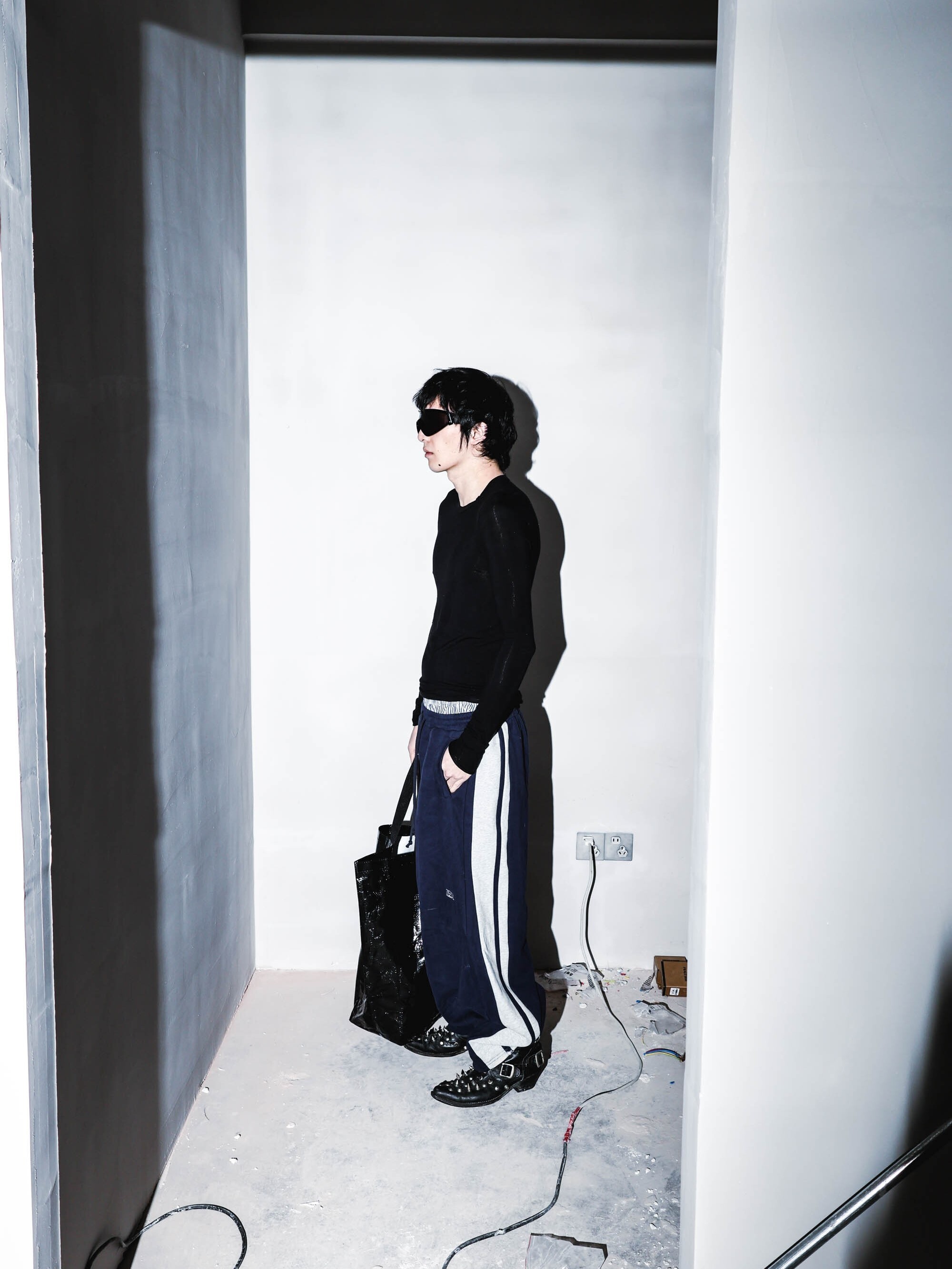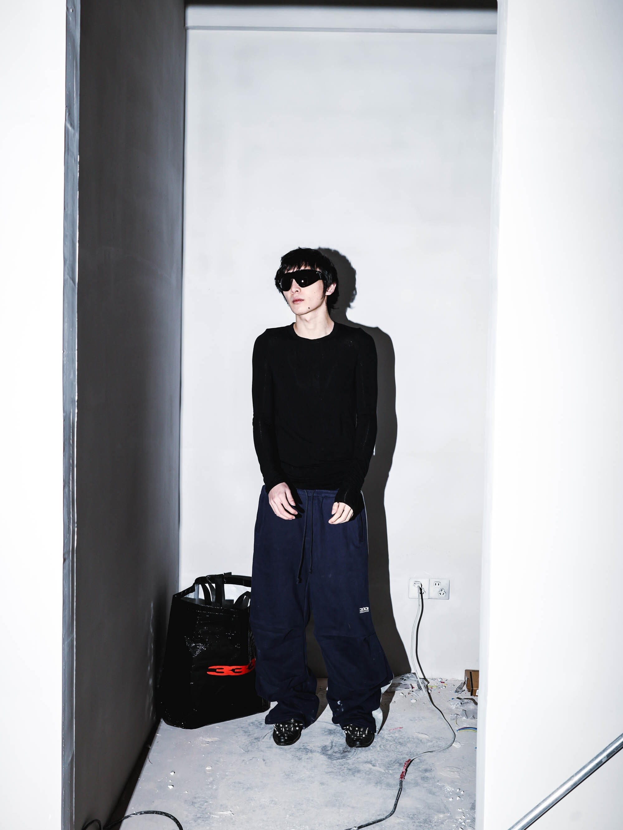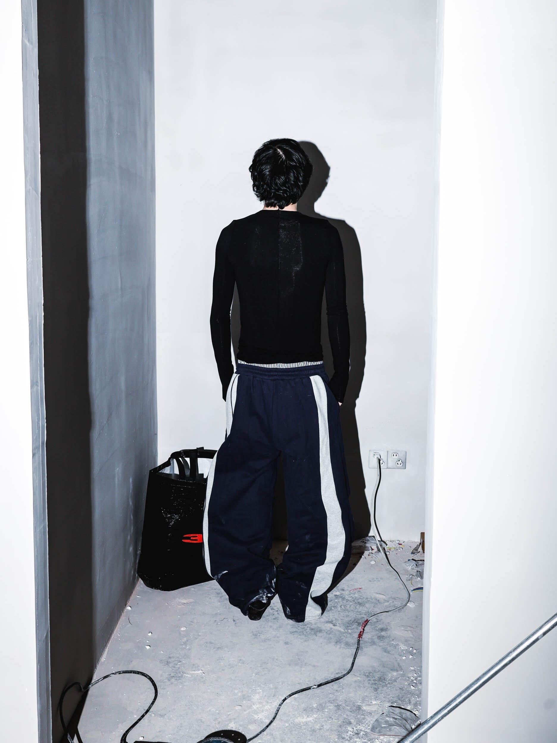 PCCVISION 3MAN0N 深藍色刺繡333 Logo條紋 拼接寬鬆 長褲