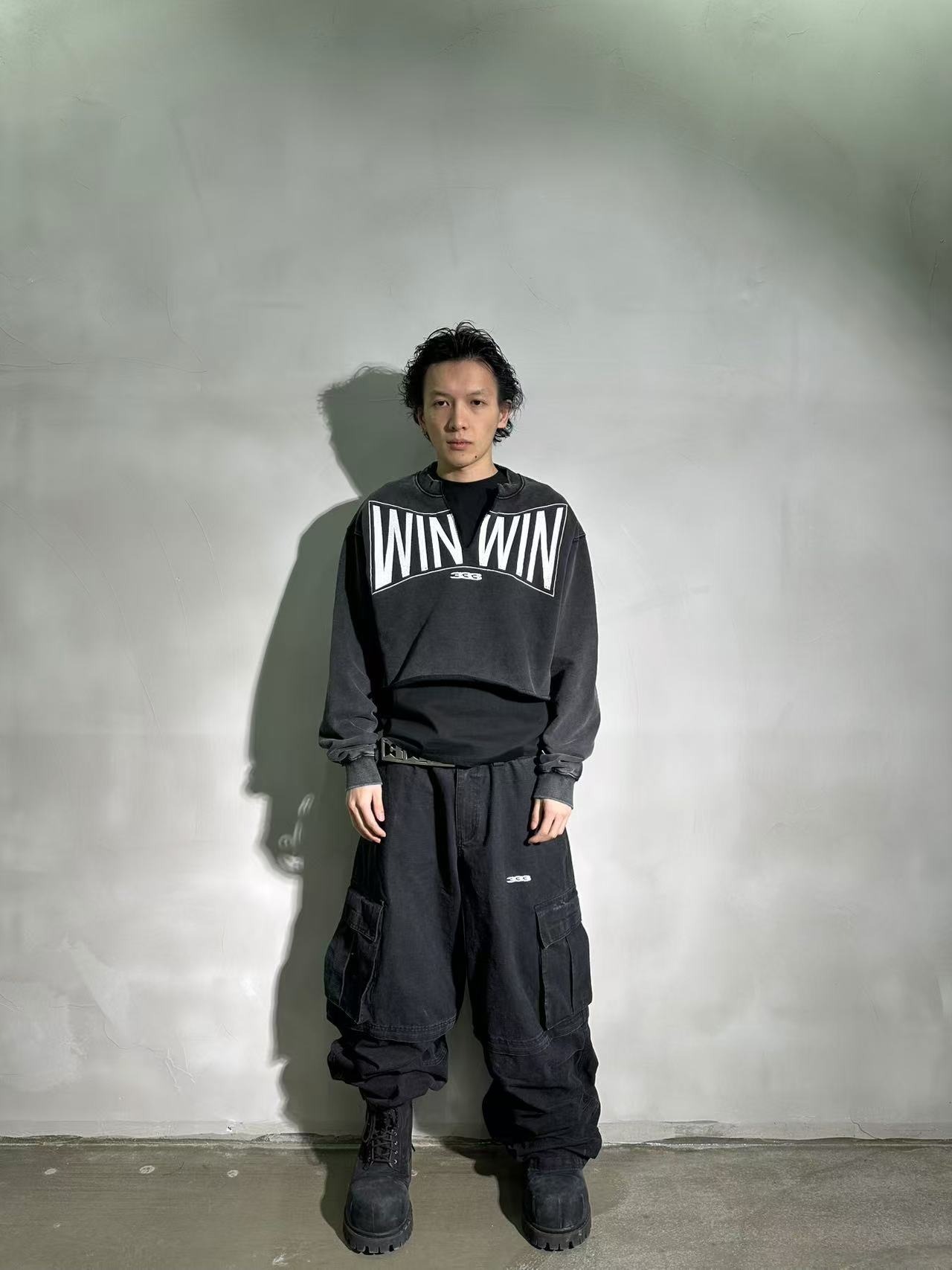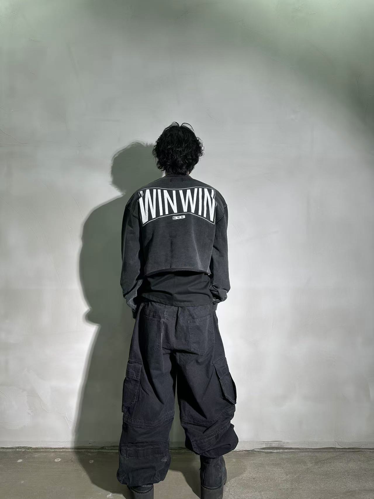 PCCVISION 3MAN0N winwin 水洗做舊V領 爆裂印花寬鬆 短版長袖T