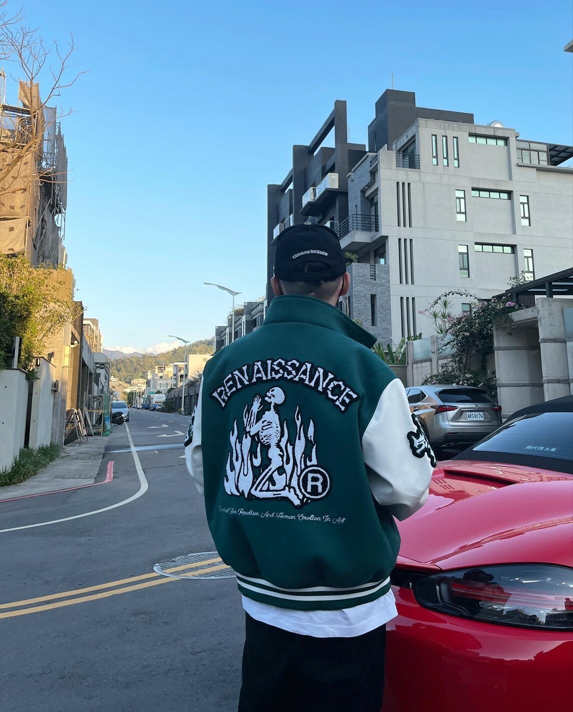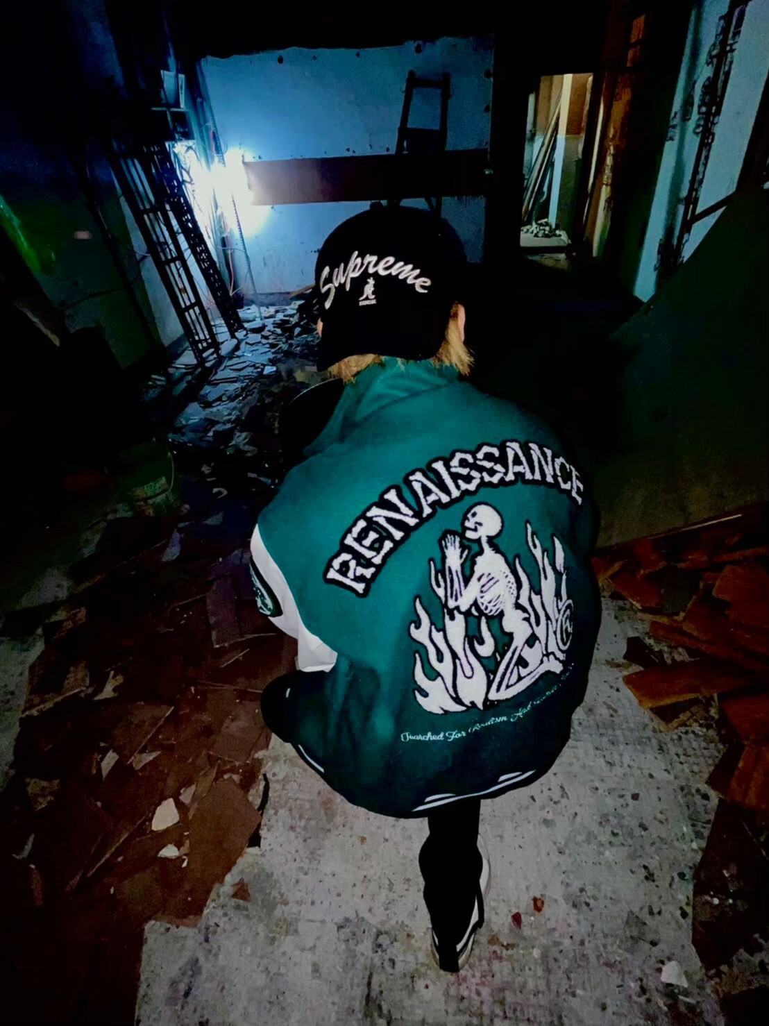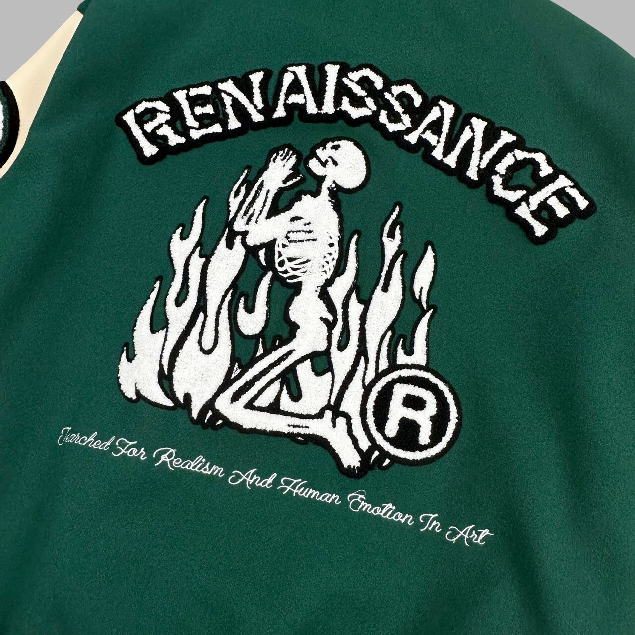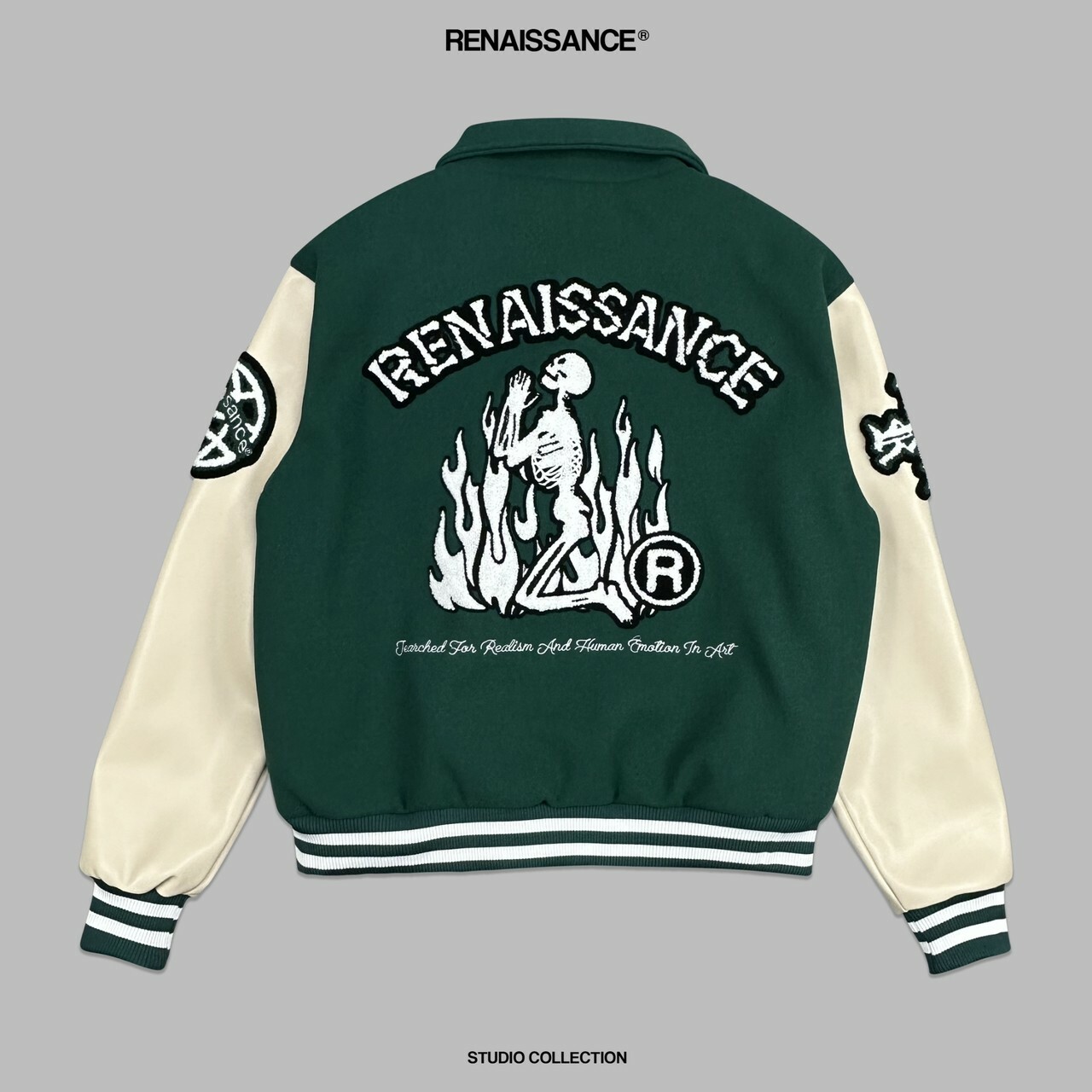 RENAISSANCE 2.0 火焰祈禱骷髏 翻領棒球外套 啞光米白皮袖棒外 高級綠 毛巾布 臂章