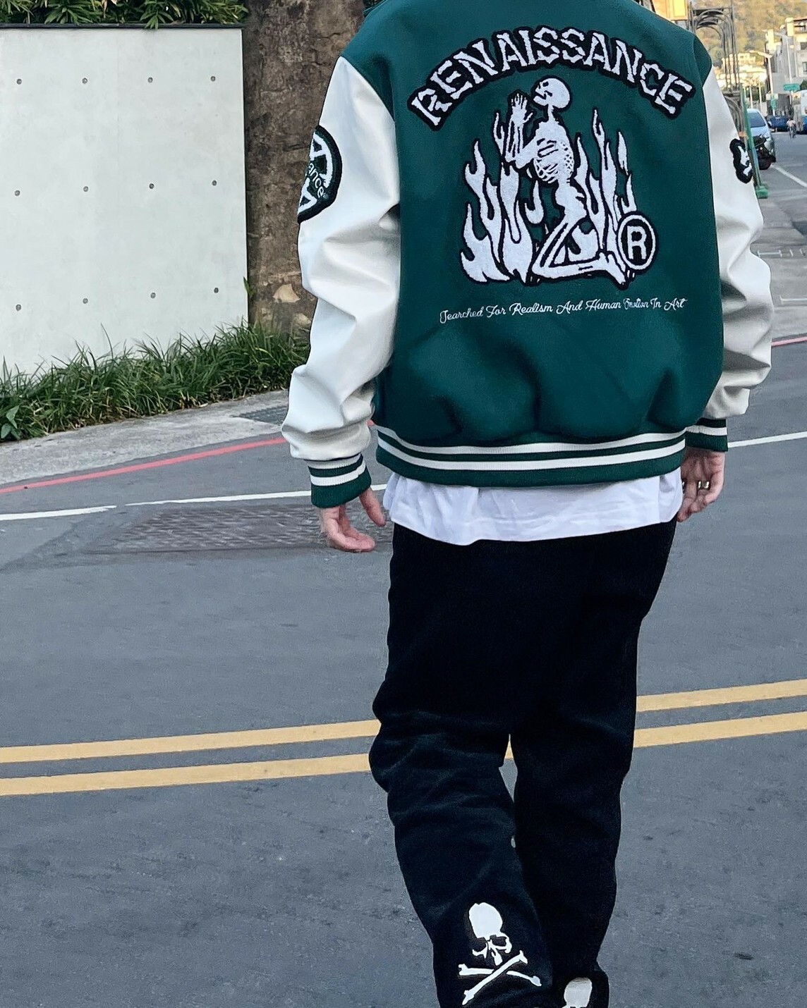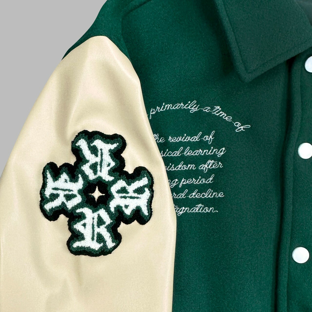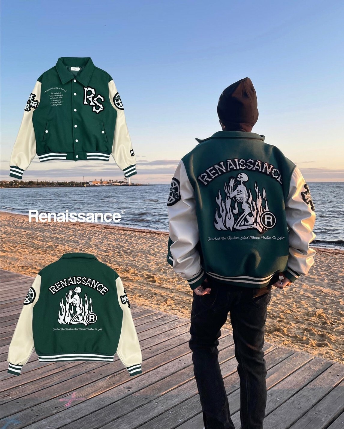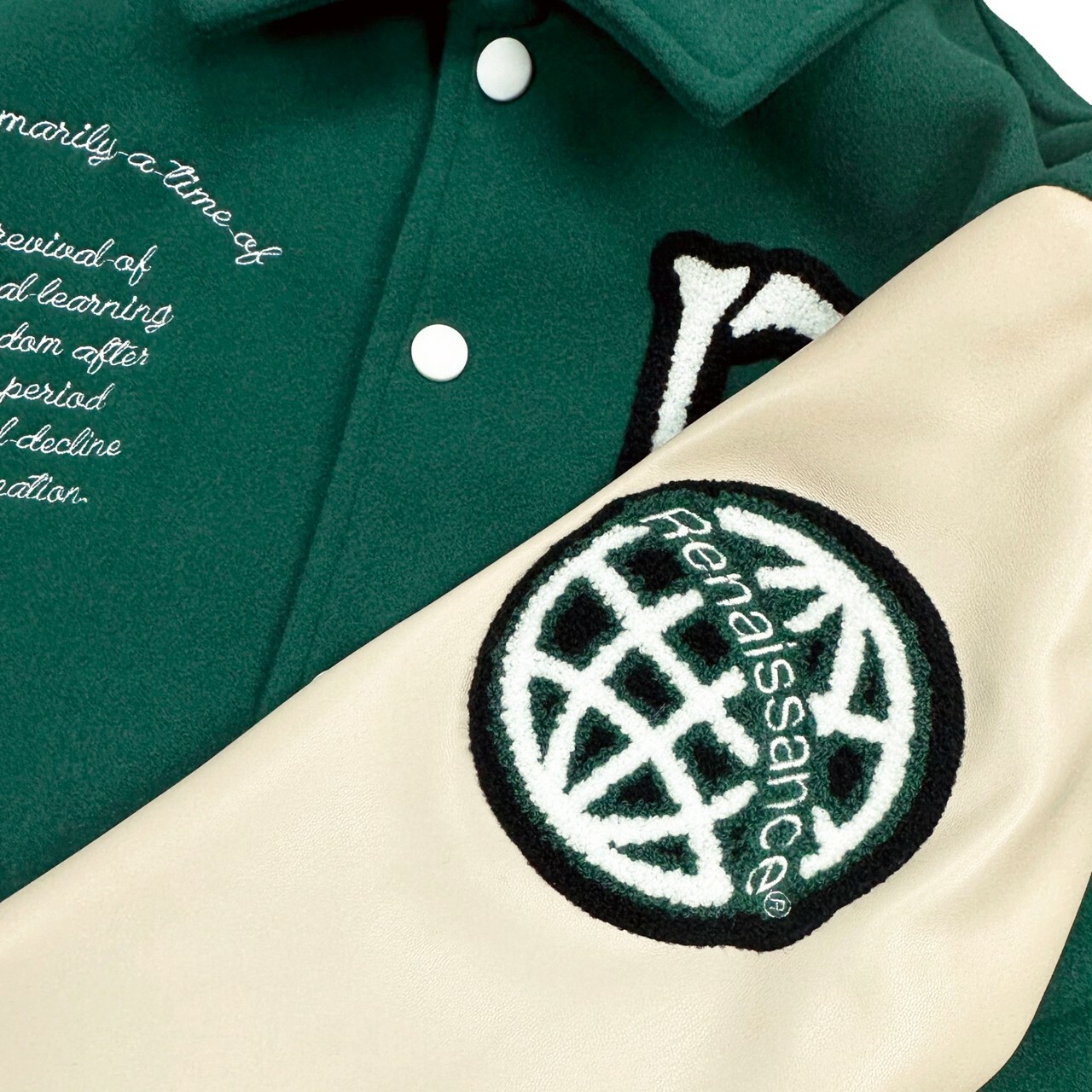 RENAISSANCE 2.0 火焰祈禱骷髏 翻領棒球外套 啞光米白皮袖棒外 高級綠 毛巾布 臂章