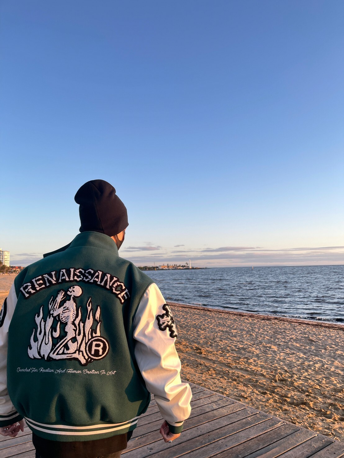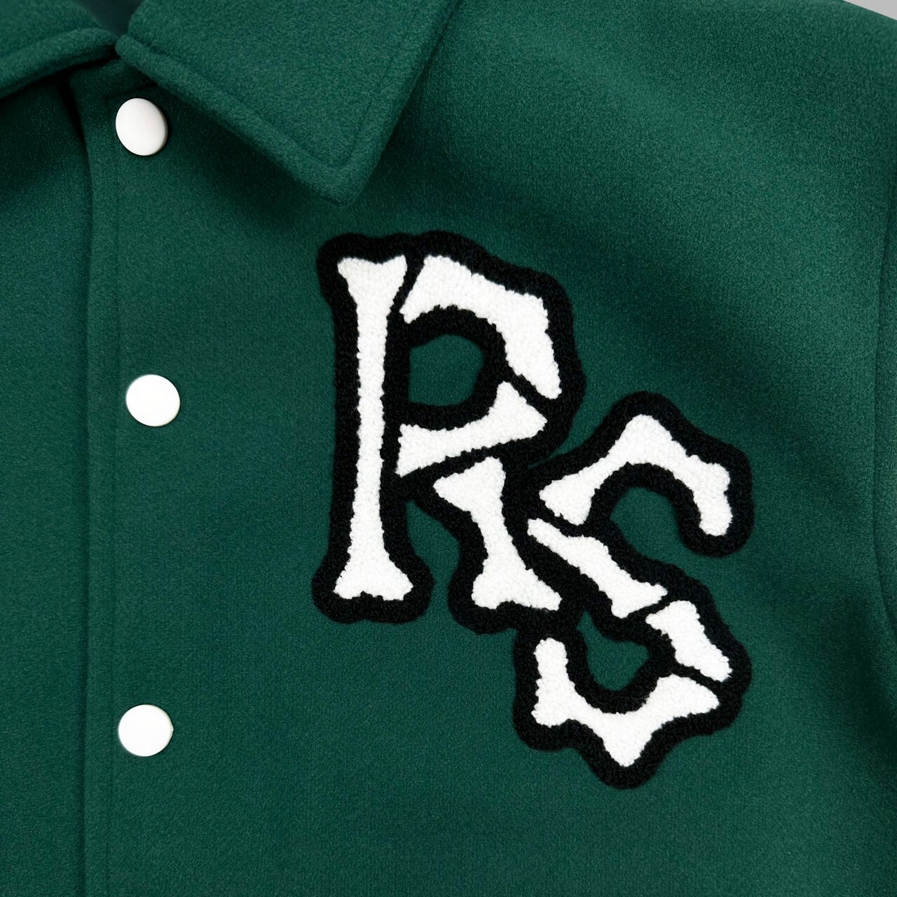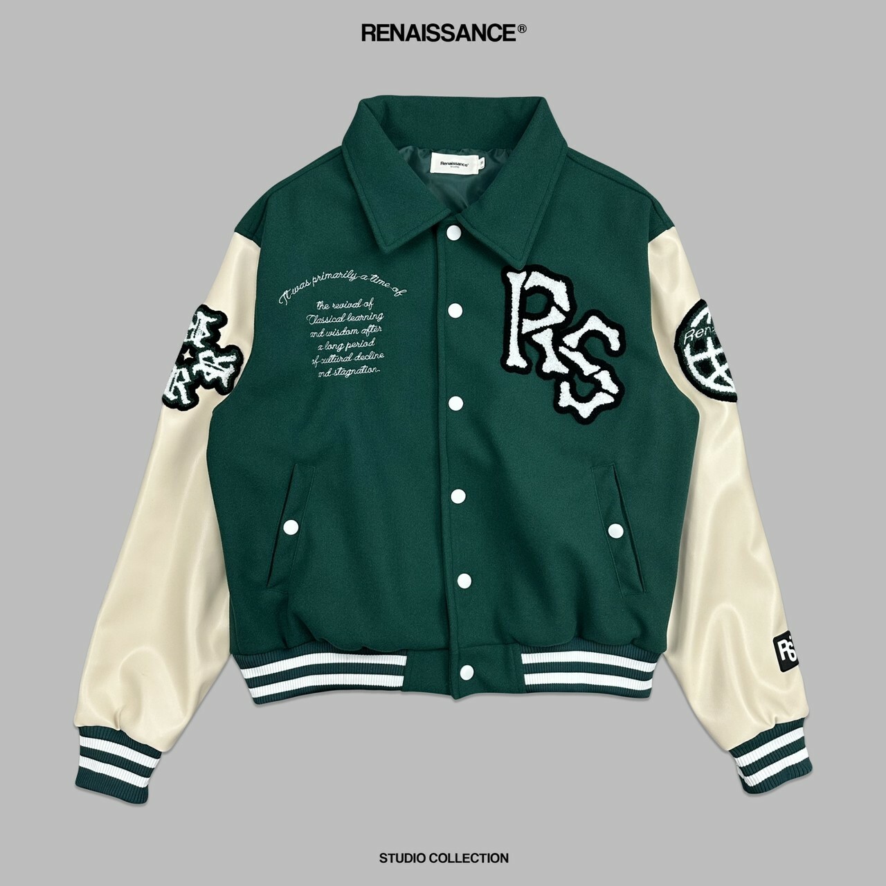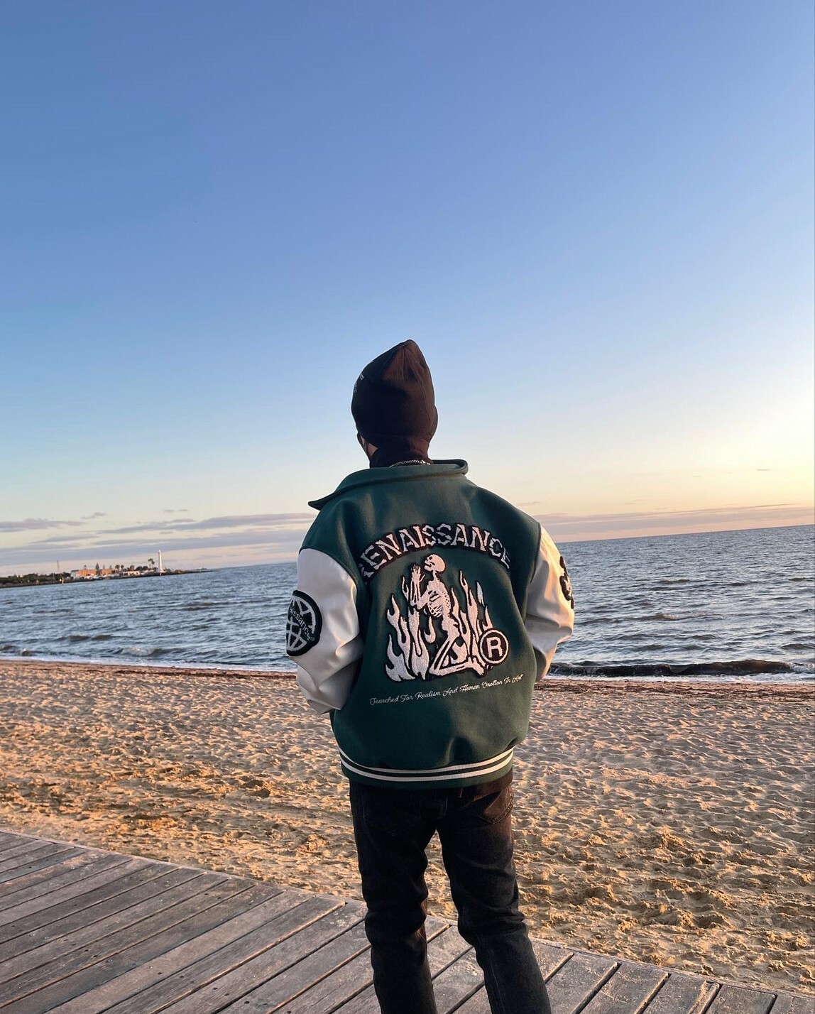 RENAISSANCE 2.0 火焰祈禱骷髏 翻領棒球外套 啞光米白皮袖棒外 高級綠 毛巾布 臂章