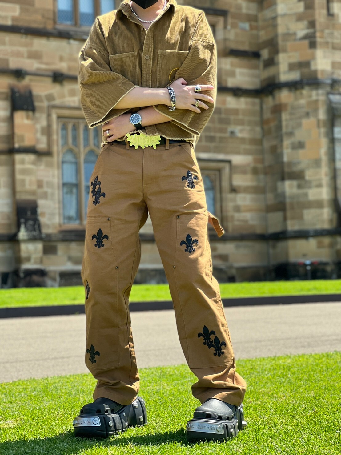 RENAISSANCE 鳶尾花皮標 大地色 拼布工作褲 VIBE “ LEATHER IRIS WORK PANTS ”