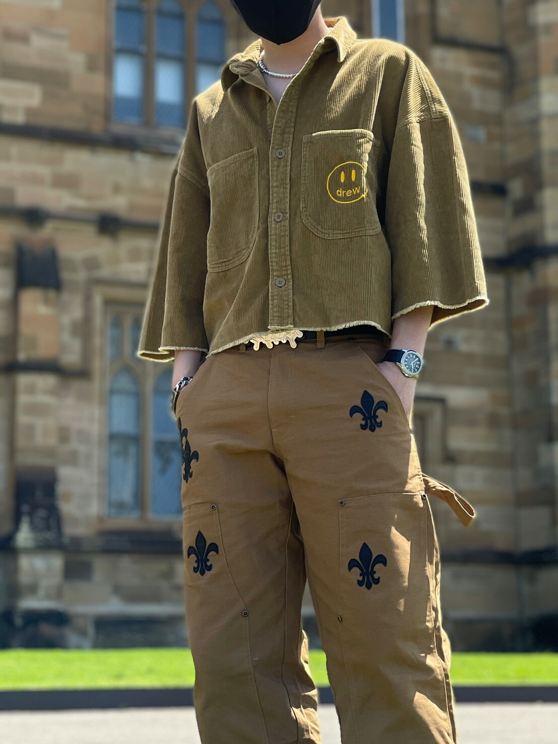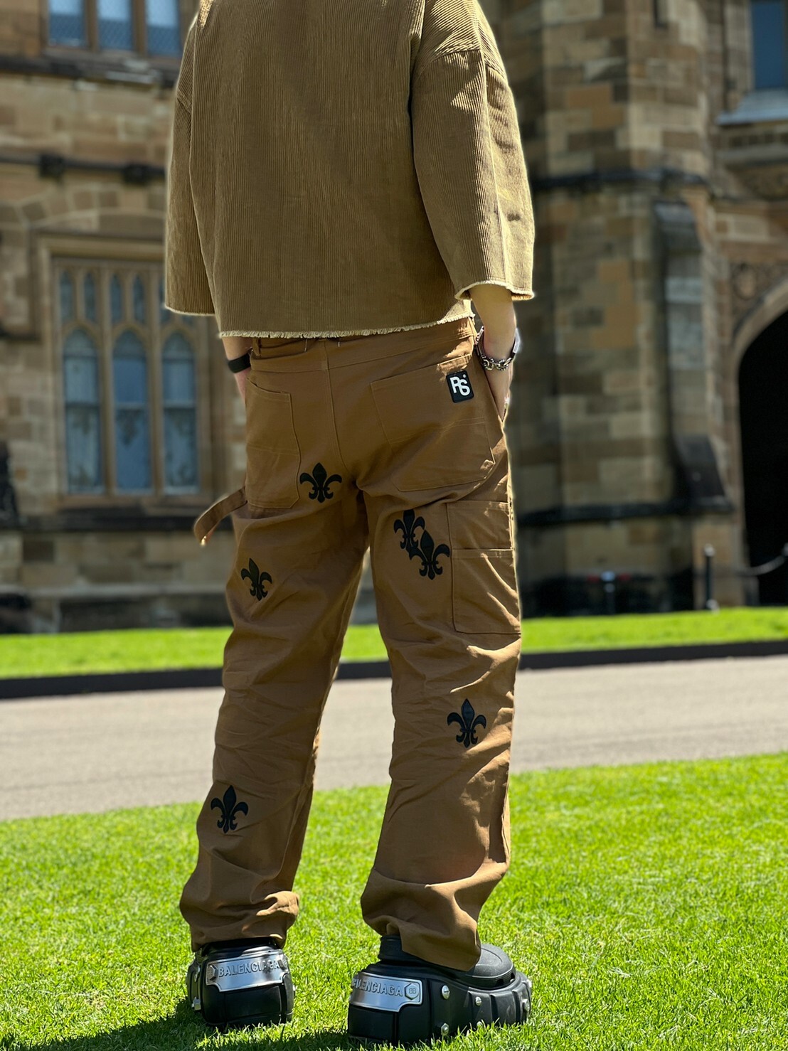 RENAISSANCE 鳶尾花皮標 大地色 拼布工作褲 VIBE