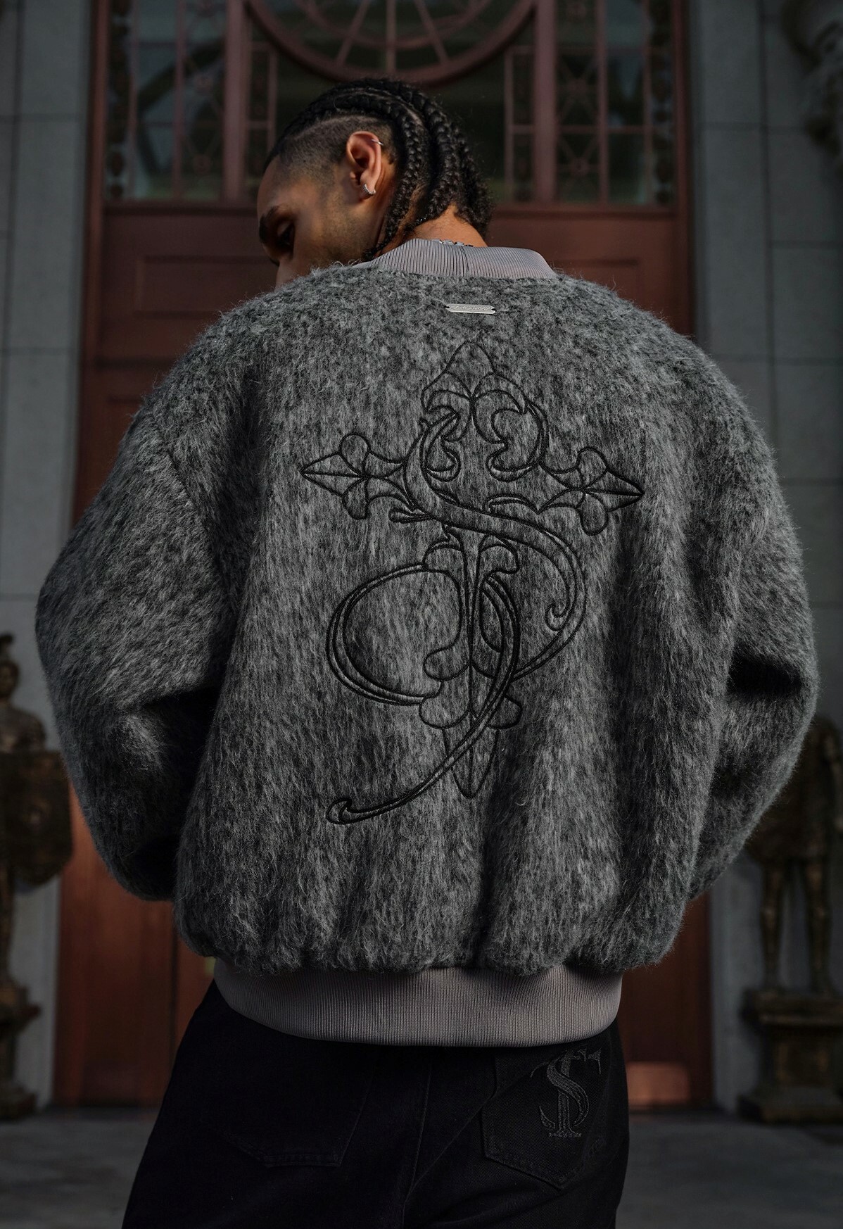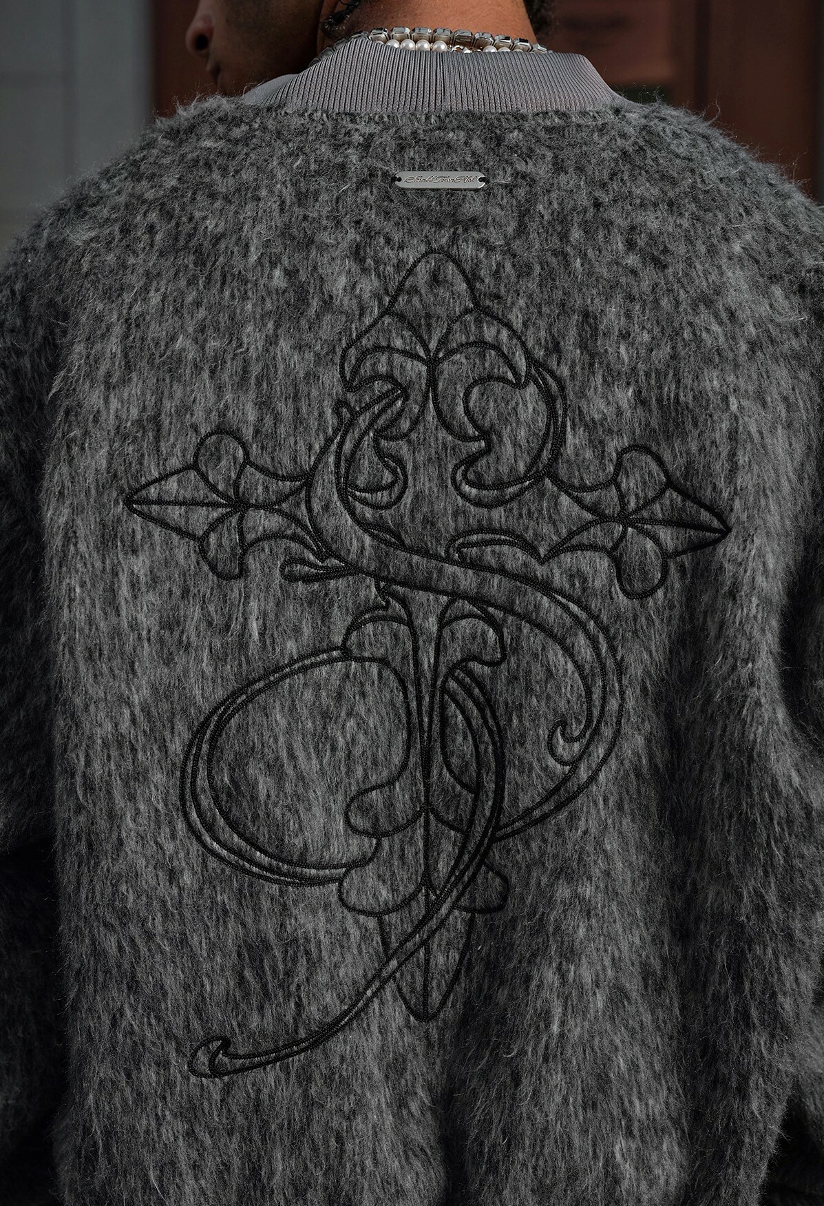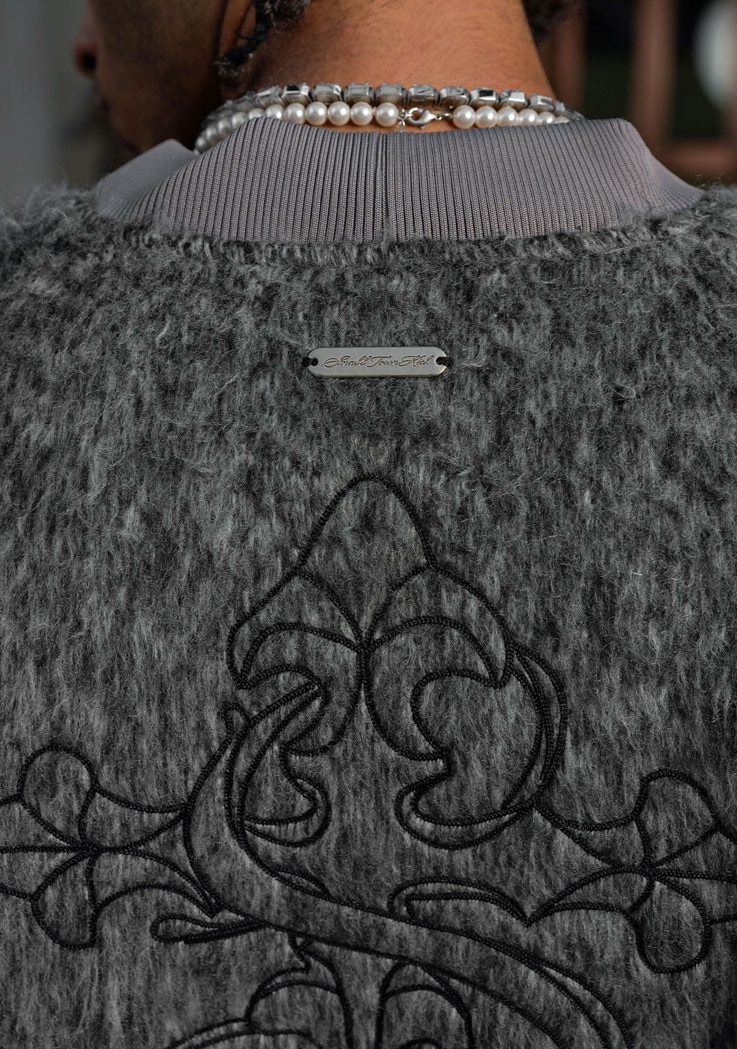 STK SmallTownKid 深灰長毛 十字刺繡 飛行外套