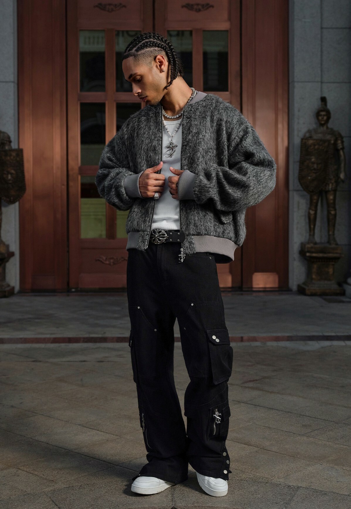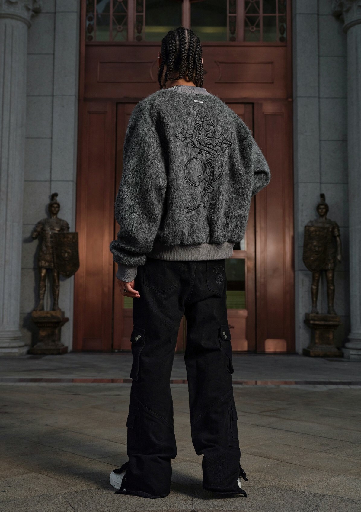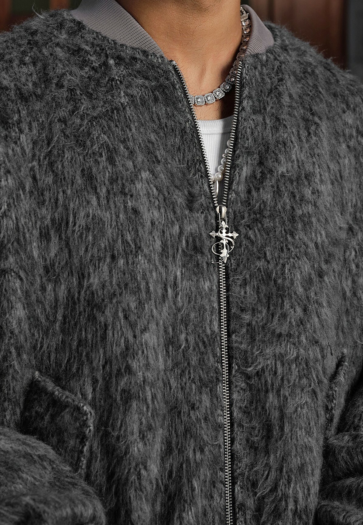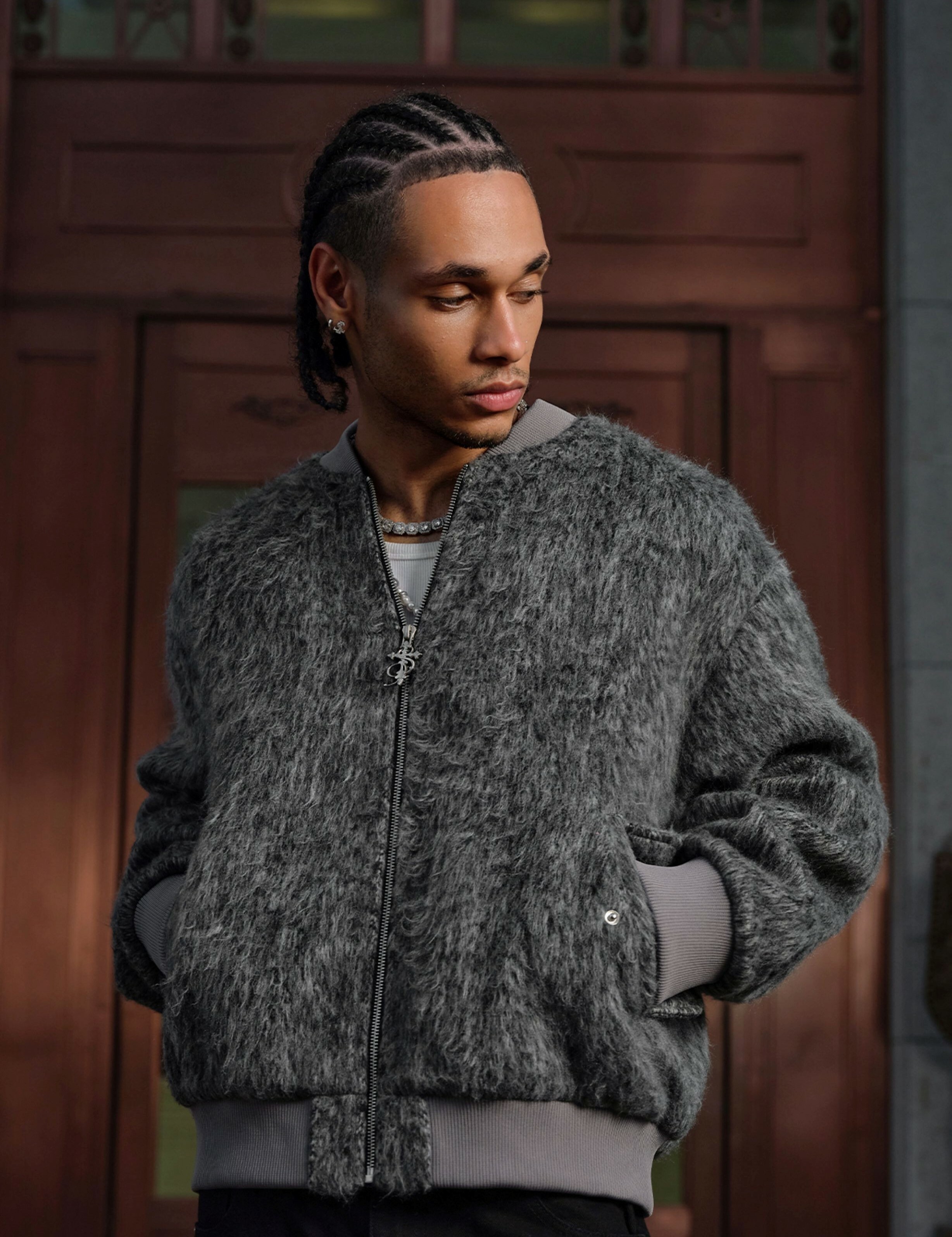 STK SmallTownKid 深灰長毛 十字刺繡 飛行外套