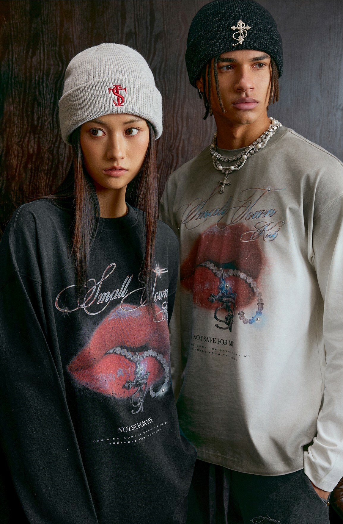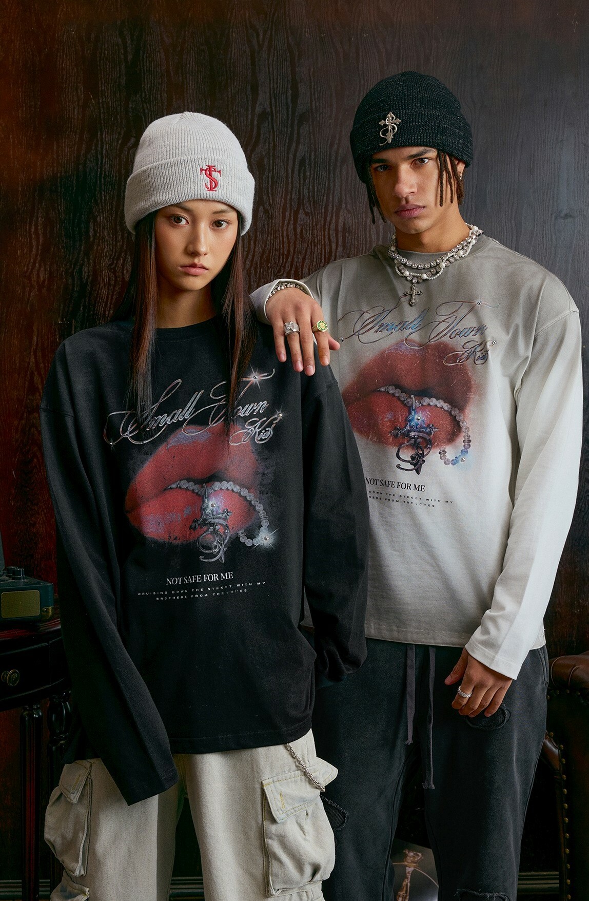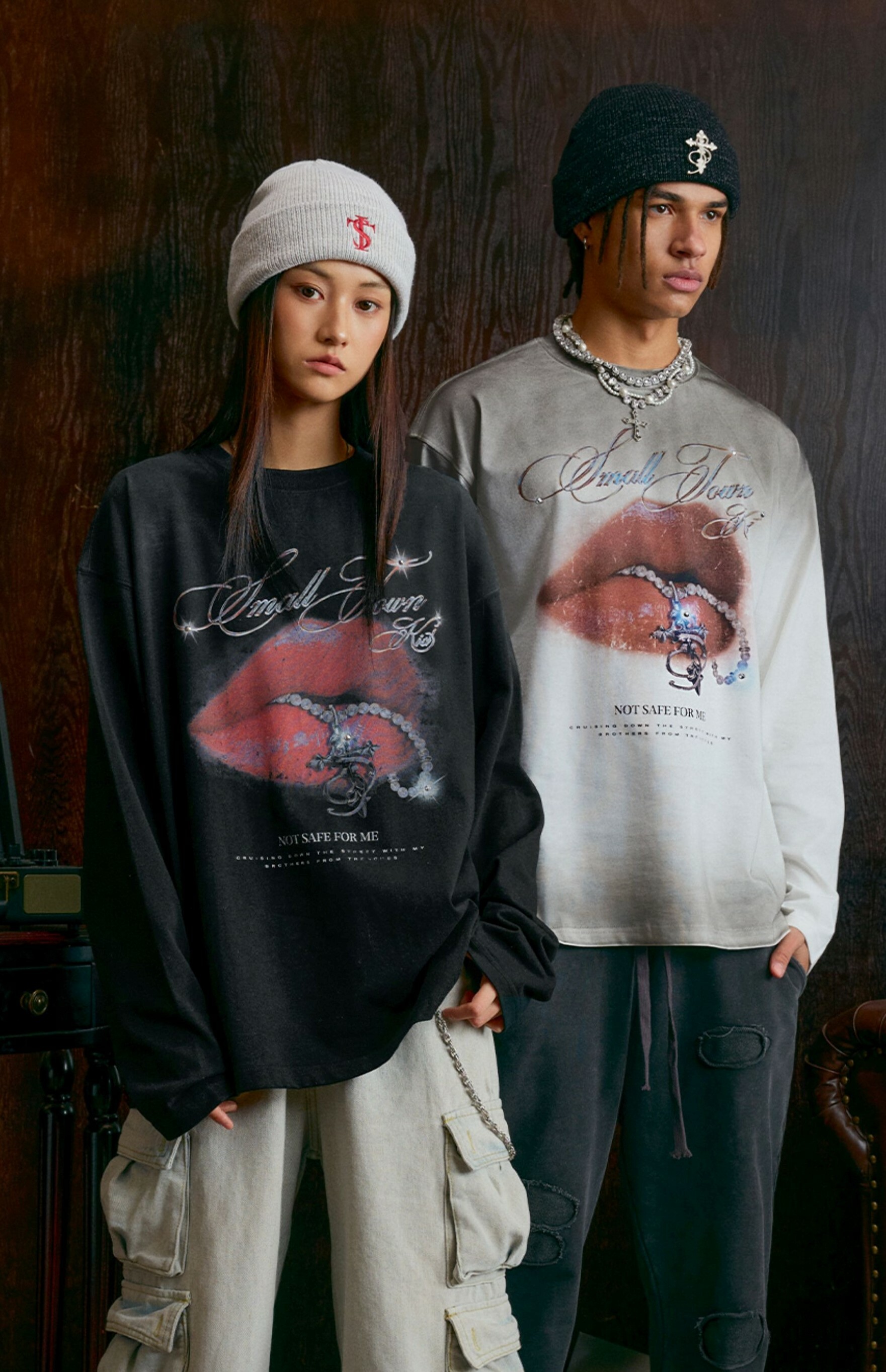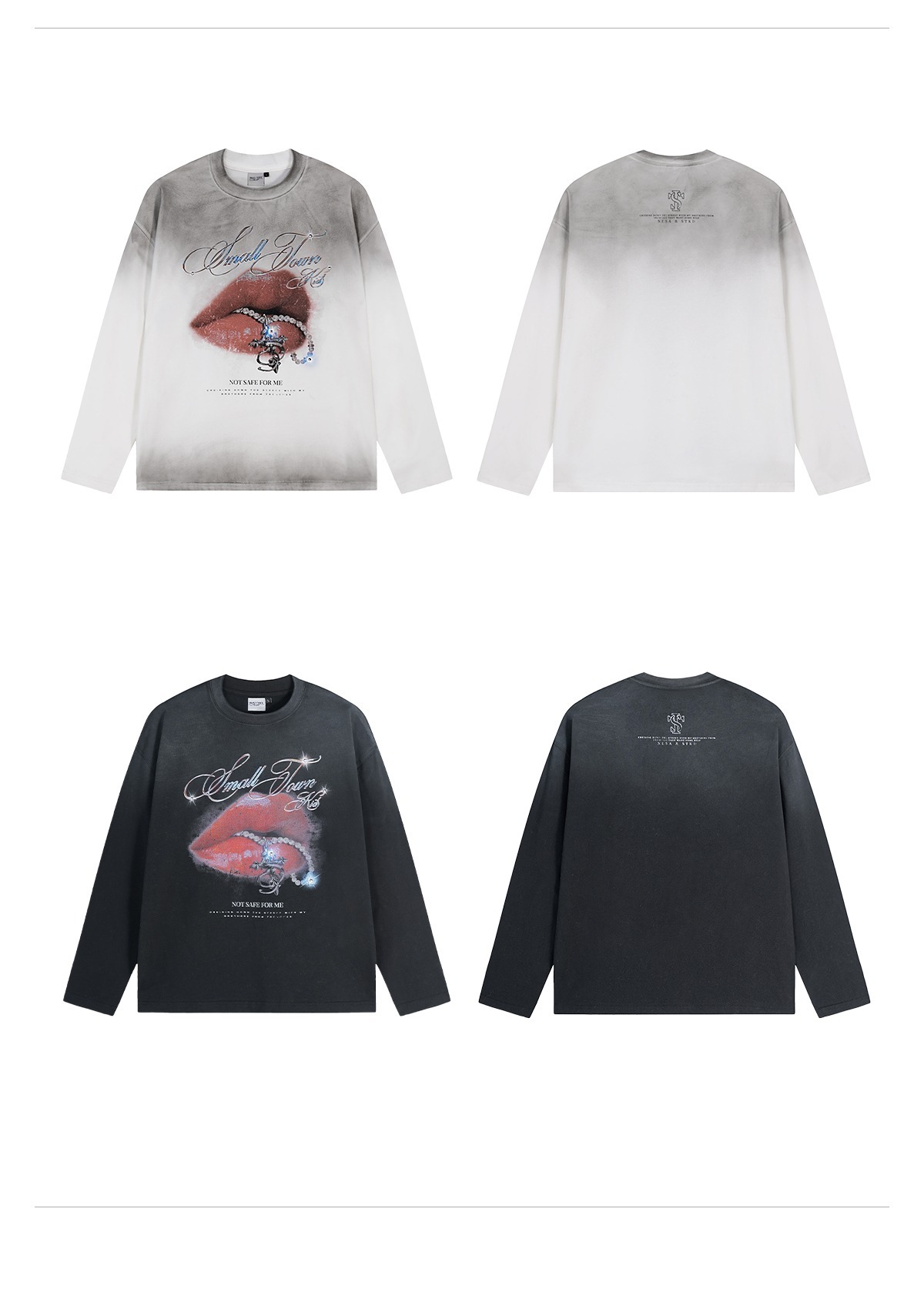 STK SmallTownKid 髒洗做舊 鑽石紅唇印花 薄長袖