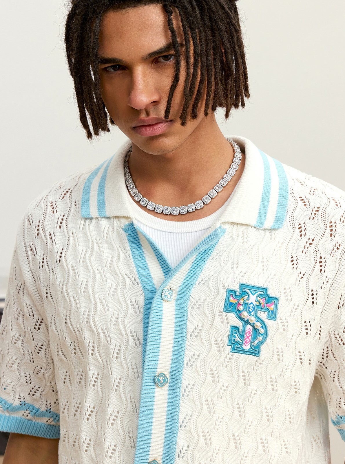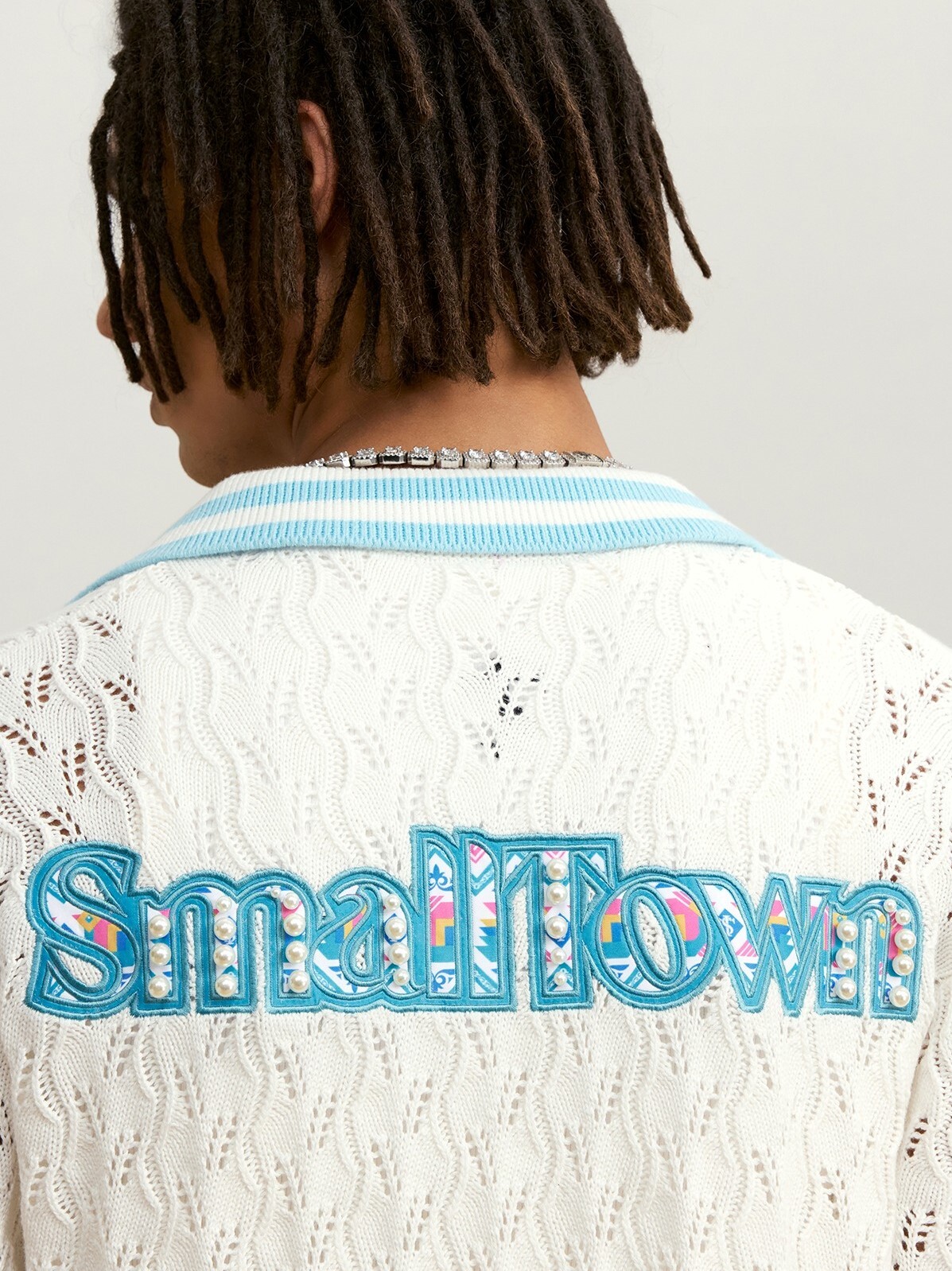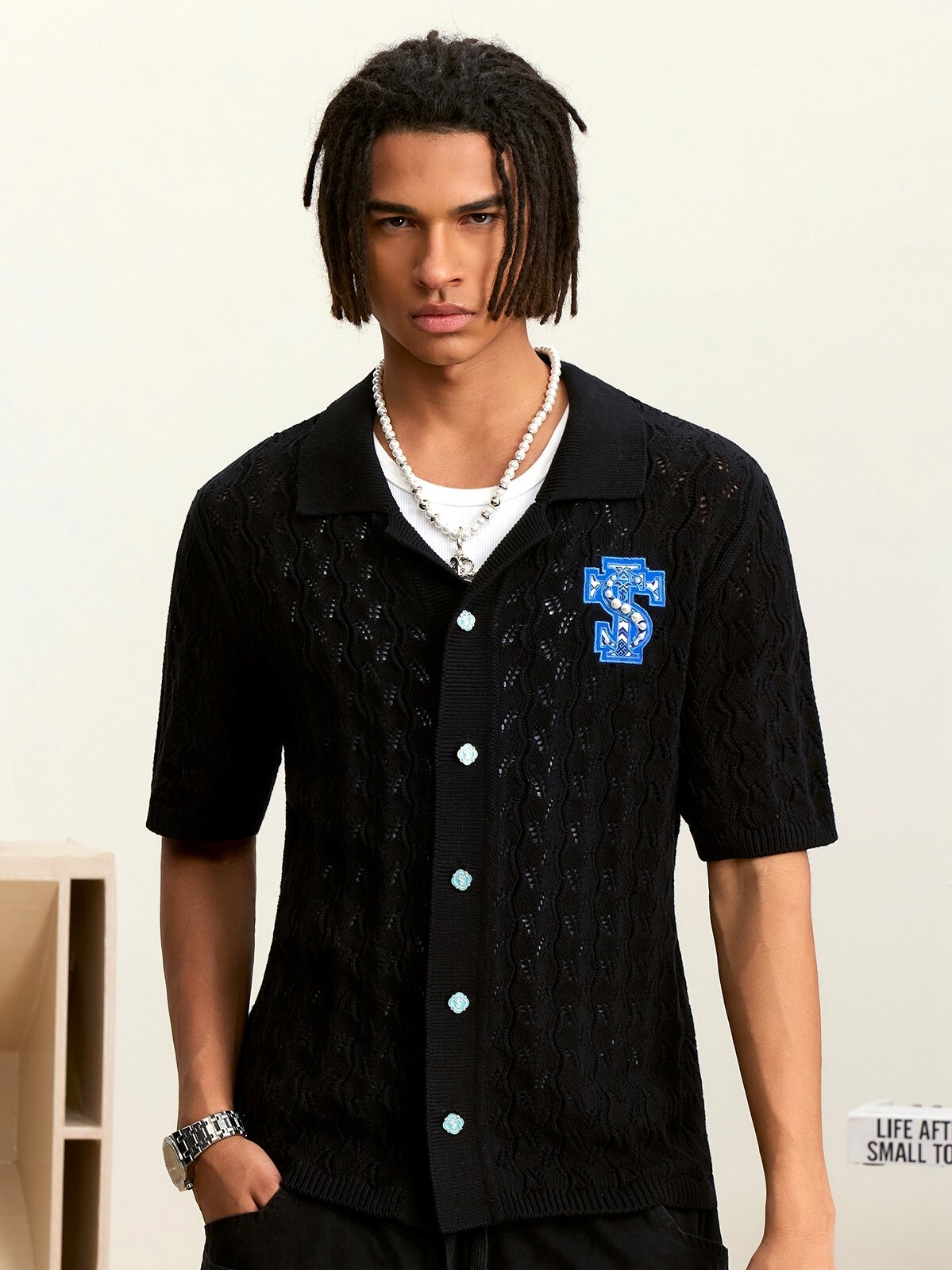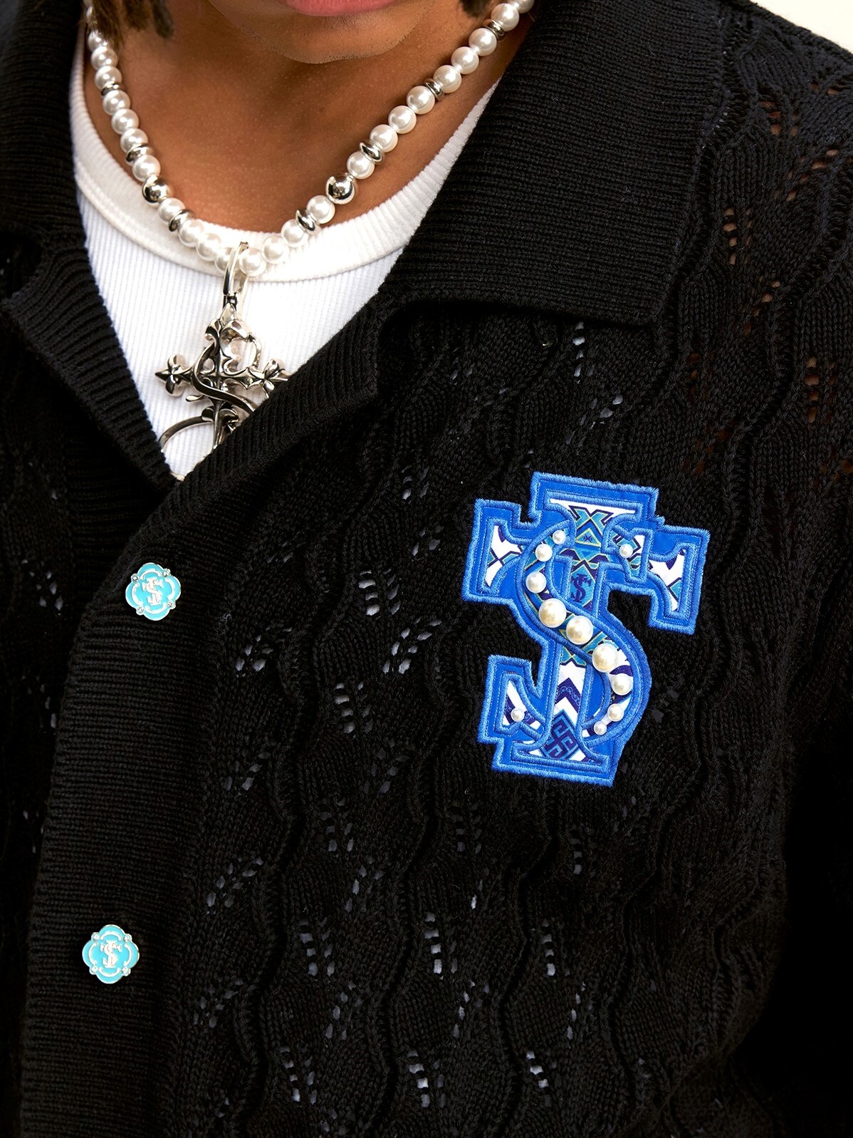 STK SmallTownKid 民族風貼布 摟空珍珠 短袖襯衫