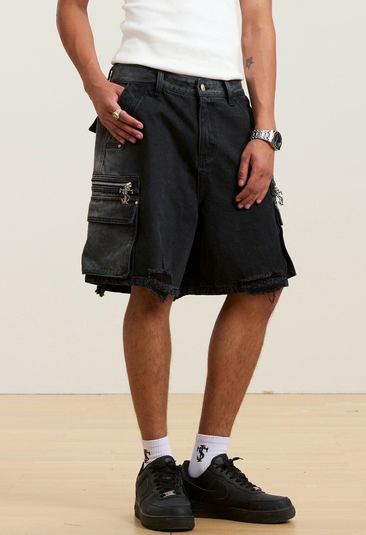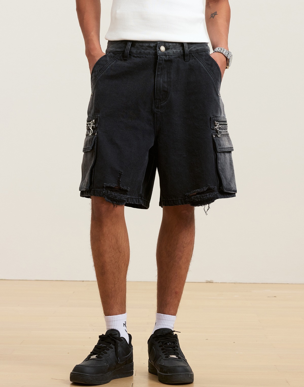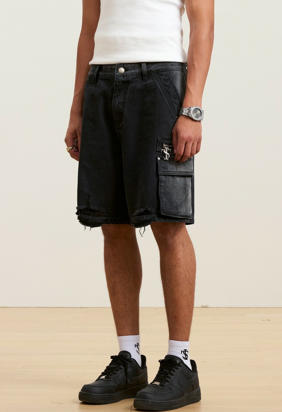 STK SmallTownKid 鉚釘破壞 工裝牛仔短褲